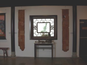 Garden Patterns, on the left of the image (above), are a pair of hangings incorporating shibori and original block print. Autumn Pool, right, features handpainting, stencilling, and katazome. Tao Te Ching 42 and I Ching 42